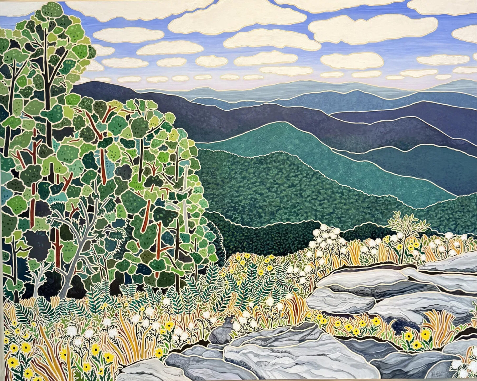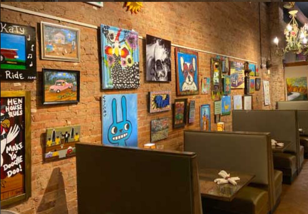 When I step inside Mary Praytor Gallery, the aura overwhelms. The gallerist shows me work from a student of her brother’s at Greenville Tech. She goes to the closet and pulls out work painted by outsider artist Howard Finster with sayings such as “Speak Kind to All!”