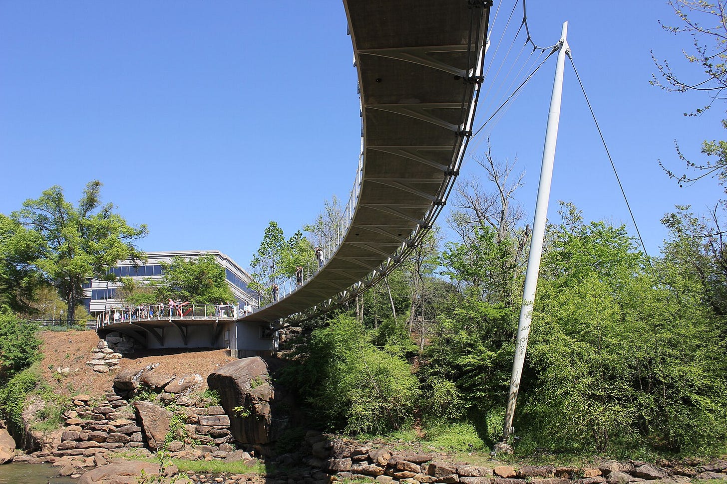 Children venture from the side paths around the Reedy onto what appear to be Gneissic granite. Women passing by wear their hair longer and more coiffed than in my North Carolina town. A man escorts two daughters in confirmation dresses, his hair shaven at only the base of his skull. Trans people pass by, dressed in vintage conservative. Both Bob Jones University and Furman University are nearby; Clemson is not far.